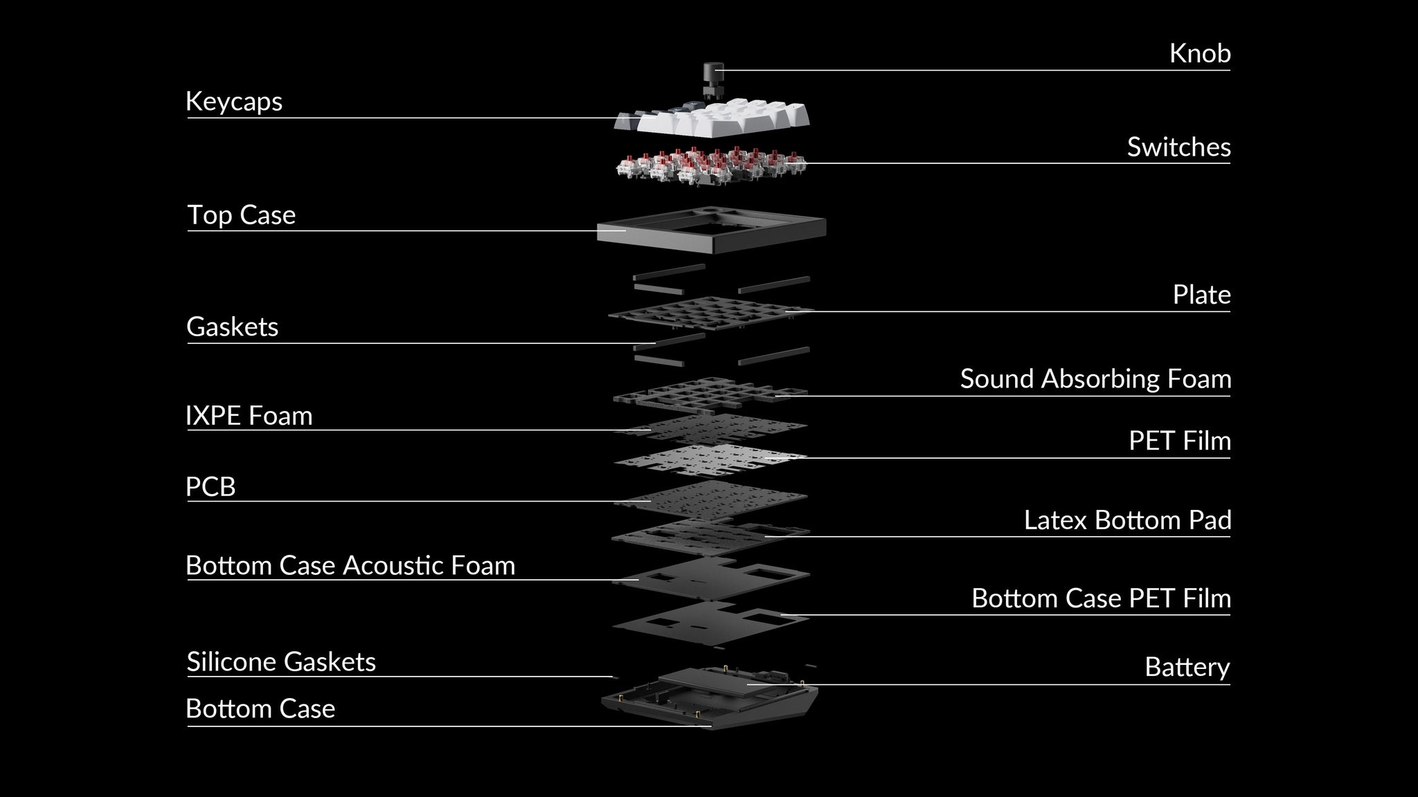 Elevate the typing experience with a combination of premium acoustic foams such as IXPE, PET, and Latex. Each keystroke becomes enjoyable, making every tap a delight for the senses. Plus, We designed every component to be able to assemble easily so you can customize and adjust each component with ease to create your ultimate typing experience.
