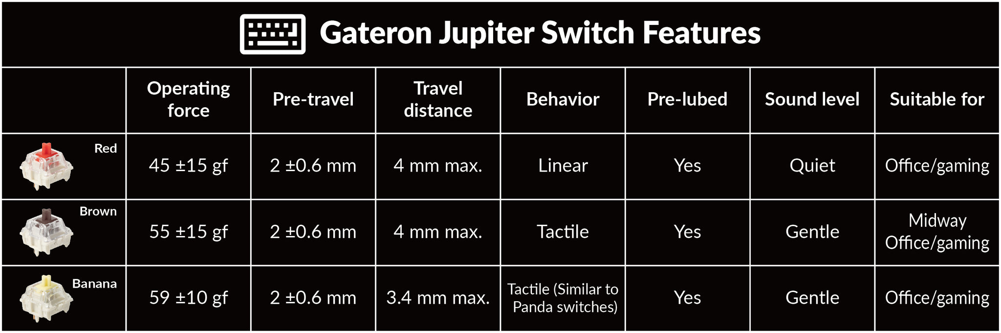 Our exclusive Gateron Jupiter mechanical switch (for the Fully Assembled version only) comes with a 3-pin design, its pre-lubed with a reliable Gateron quality standard with up to 80 million keystrokes lifespan. While their unique LED diffuser design offers high RGB backlight transmittance and softer backlight effect. The banana switch provides an early tactile bump at the top with a uniquely smooth experience like those Panda switches on the market.